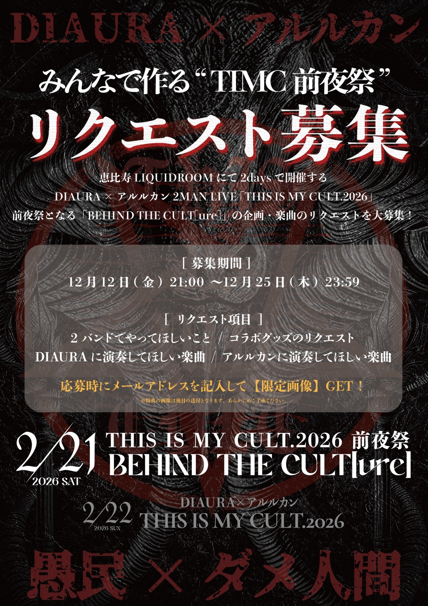 2月21日に恵比寿LIQUIDROOMで開催するDIAURA × アルルカン 2MAN LIVE THIS IS MY CULT.2026 前夜祭「BEHIND THE CULT[ure]」の企画・演奏楽曲のリクエストを大募集!